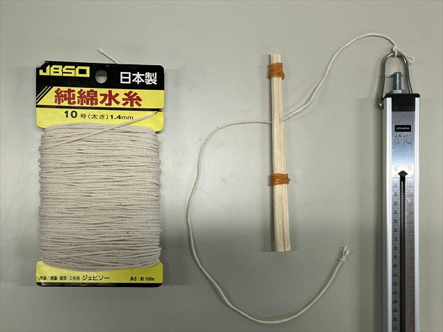 浮力実験用体をつるすのに使用する。「たくみの下振用糸」をホームセンターで購入。組紐加工になっていて、浮力実験用体が回転しない。糸の端はチャッカマンであぶるとほつれなくなります。30cmの長さに切って、端を5cm折り返して輪っかを作る。