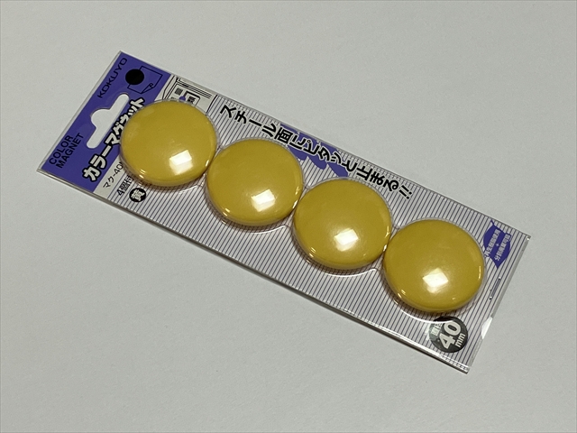 [実験2]について、上記では鋼製の棒磁石を使用しているが、後日適当な磁力の黒板用フェライト磁石が見つかったので、現在はそれを使用している。磁力がソフトで使いやすい。(コクヨ カラーマグネット 直径40mm 4個パック 赤 マク-40NR ¥374 下記写真参照。)