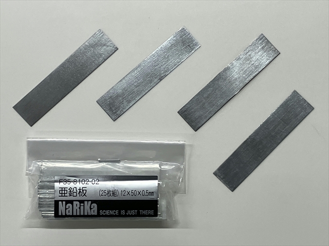 電池の実験などでよく使う板状の亜鉛を使用します。スマートスクール「金属板セット 穴なし(25枚入)①亜鉛 728-173 1111円」