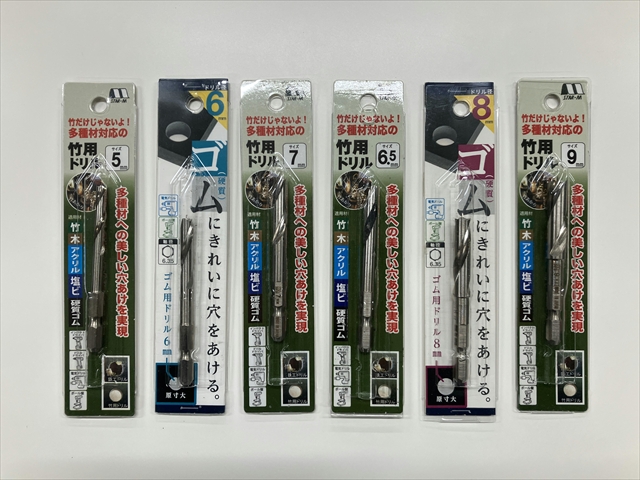 ゴム栓に8mmの穴を開けるときは、「スターエム 竹用ドリル」 (STAER-M) 8mm 601-080 1063円 が便利です。 竹の他、木、アクリル、塩ビ、 硬質ゴム にきれいに穴を開けることができます。同じ物が以前は「ゴム用ドリル」の名前で売られていました。(下写真参照)