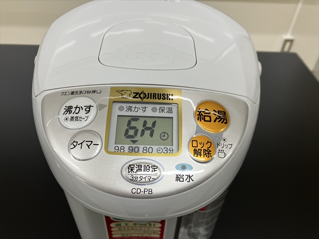 下写真の電気ポット ZOJIRUSHI CD-PB の場合、水温が45℃になったときに、タイマーのボタンを押すと、お湯は出るけれども 加熱はストップした状態になります。(注:タイマーのボタンを押すと、お湯が出なくなる電気ポットもあります。)10℃の水3Lを45℃にするのに、約7分かかります。