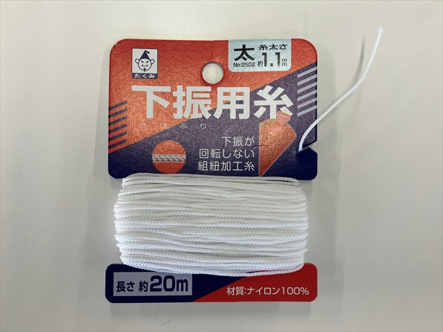 浮力実験用体をつるすのに使用する。「たくみの下振用糸」をホームセンターで購入。組紐加工になっていて、浮力実験用体が回転しない。糸の端はチャッカマンであぶるとほつれなくなります。30cmの長さに切って、端を5cm折り返して輪っかを作る。