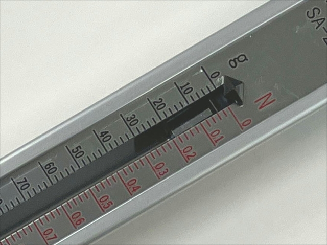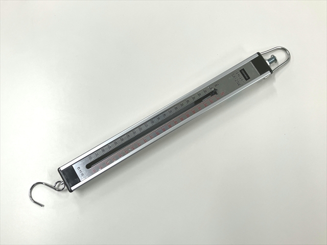 この実験には2Nのばねはかりが必要です。写真のばねはかりは昔からあるタイプのものですが、指針と目盛りが密着しており、目盛りが読みやすくて使いやすいです。