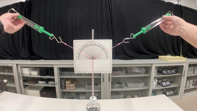 角度をもってはたらく2つの力とその合力の関係を調べる実験です。2つの力を2辺とする平行四辺形の対角線がその合力となります。今までは、ばねやゴムを決められたところまで伸ばす方法で実験していましたが、なかなかきれいな平行四辺形になりませんでした。