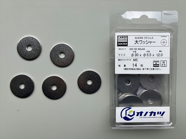 オノカツ 純国産SUS304 ステンレス 大ワッシャー M5用 【外径30mm, 厚み 2mm】14枚入 960円