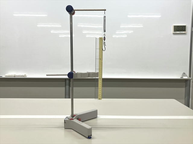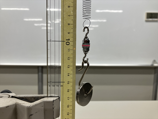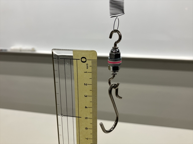 3 おもりをフック(中)にかけて、ばねののびを測定する。
