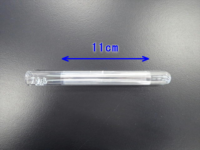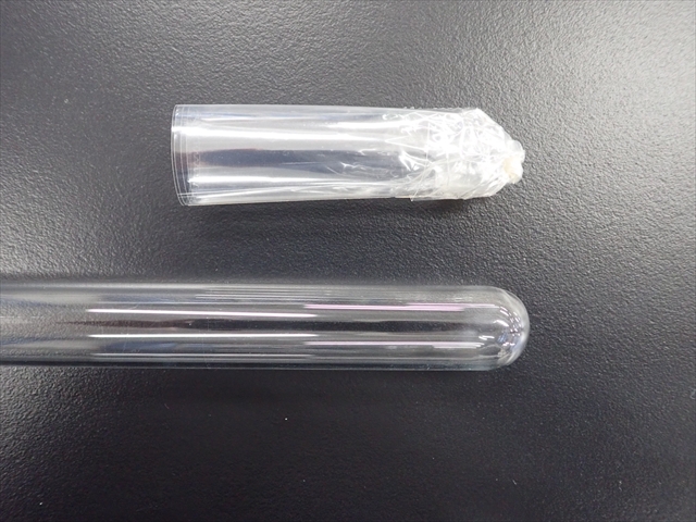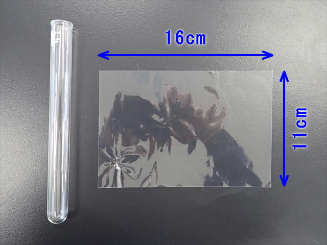 1 16×11cmに切ったセロハンを、18×180mmの試験管に巻き付け、巻き終わりの部分を上から下までセロハンテープでとめる。一度にとめようとすると難しいので2、3回に分けてとめたのでよい。