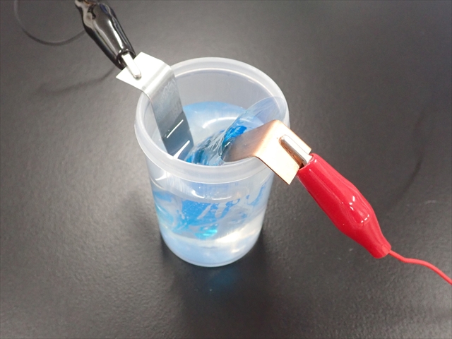 金属板の端を折り曲げておくと、ミノムシクリップが水溶液につかるのを防ぐことができる。