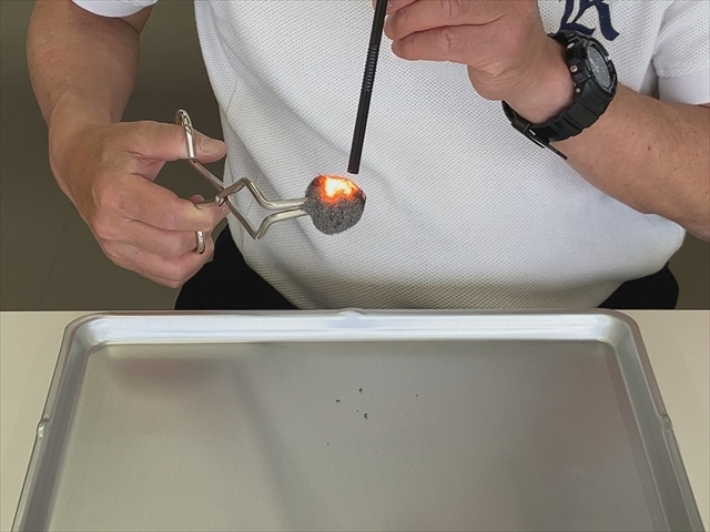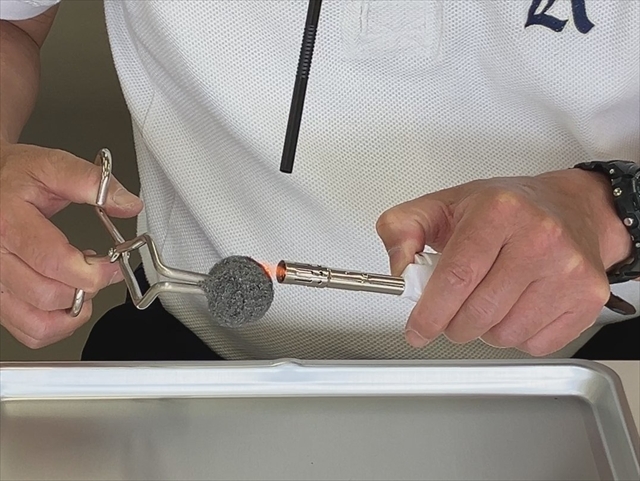 スチールウールの燃焼です。通常、この実験を行う場合、スチールウールをガスバーナーの火で加熱しておいて、素早くストローで吹いて燃やします。しかし、なかなかうまく燃やせない生徒がいるのではないでしょうか。ストローで吹くのが間に合わなかったり、何度もやり直すうちにスチールウールの外側だけが真っ黒になってしまったり・・・。内部までしっかり燃焼させることができないと、燃焼後のスチールウールに電流が流れてしまいます。