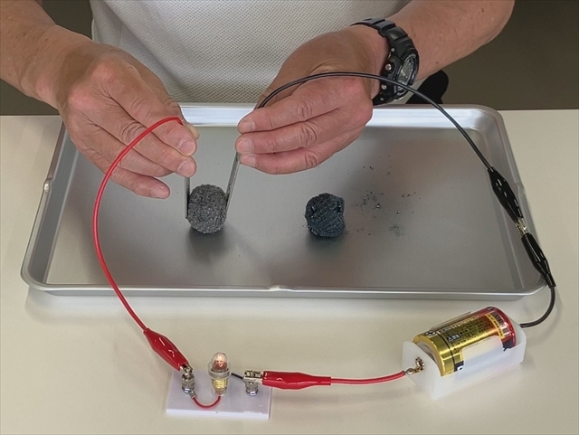 【動画:スチールウールや酸化鉄に電流が流れるかどうか。】