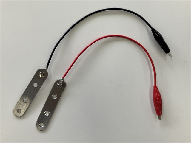 そのようなことを防ぐため、私は下写真のようなものを使用している。ステンレス製の板ではさんで調べるようにさせている。このとき、板状のものにするのがポイントである。なぜなら、棒状のものにすると、燃焼後のスチールウールに突き刺すようにしてしまうことがあり、その場合も電流が流れてしまうことがあるからである。