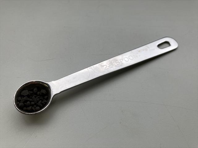 3.0gの二酸化マンガンは、2.5mLの計量スプーンにすり切り1杯程度である。計量スプーンではかりとって各班に配付すると時間が節約できる。すりきり棒は使わない方がやりやすい。(下写真参照)