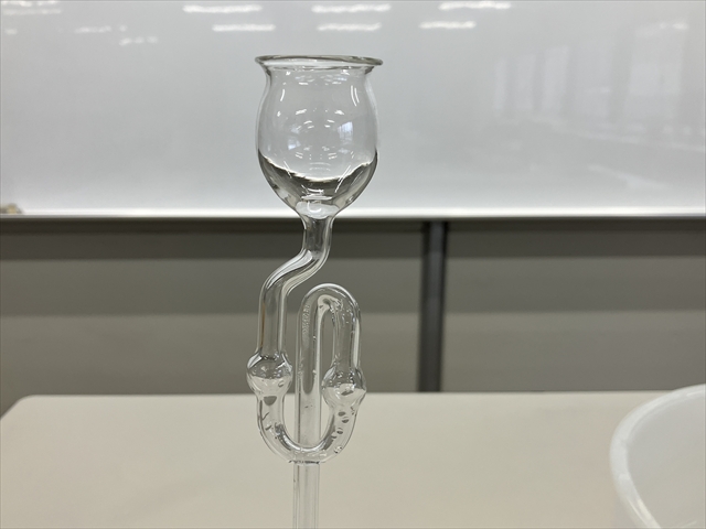 ④ 安全ろうとの足の先は中の液体に付かないようにします。中に入れた液体が多くなってくると付く場合がありますが、それは問題ありません。ろうとの足が汚れるだけなので、基本つけないようにします。