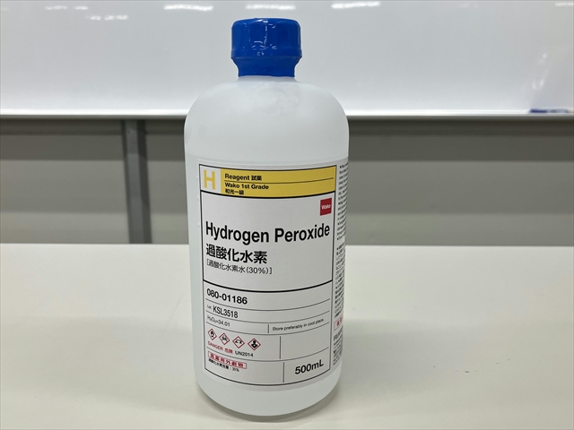 ※ 一般的にうすい過酸化水素水のことをオキシドールという。濃度がこい過酸化水素水が付着すると、皮膚が白くなり痛む。(薬品による火傷)5%の過酸化水素水は、手についても大丈夫ですが、すぐに手を洗うようにしてください。