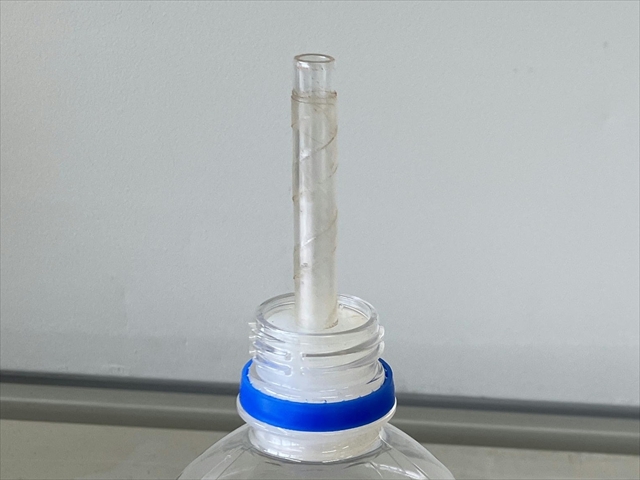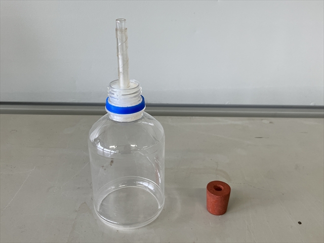 ガラス管の長さはゴム栓のところからガラス管の先端までが8cmになっています。ガラス管にはビニールテープを巻いて、万一割れた場合にも飛び散らないようにしていますが、先端部のみ火をつけるのでビニールテープが巻いてありません。ガラス管を外径6mmにするとうまくいきません。また、ガラス管の長さも大切で、長すぎても短すぎてもうまくいきません。ゴム栓は爆発時に抜けないようにするため、ペットボトルの内側から刺してあります。