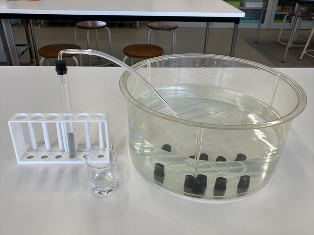 ※ 水素の一番の特徴は可燃性です。そのため、私は試験管に5本捕集して、4本で可燃性を調べ、残りの1本で助燃性を調べるようにしています。1本目は空気が混ざっているために取り直します。実際には5本しか捕集しませんが、以下の内容で6本分取ることができます。