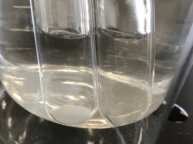 4 食塩の方はほとんど変化がないが、硝酸カリウムの方はすべてとける。(水温約60℃で硝酸カリウムはすべてとけます。水温が70℃になったらガスバ-ナーの火を消す。)(下写真参照)
