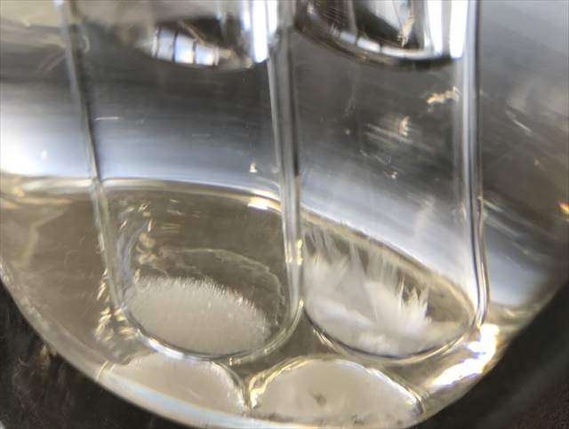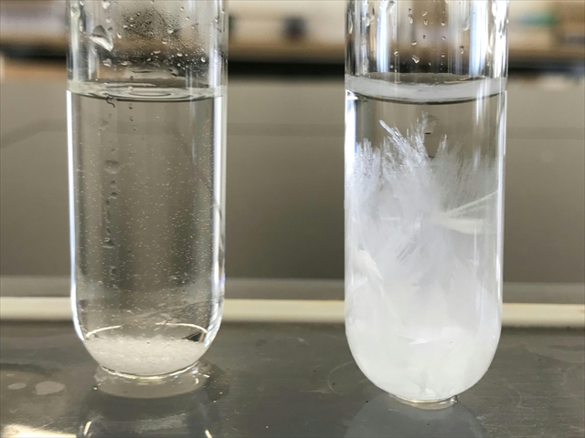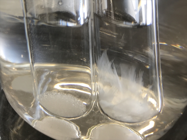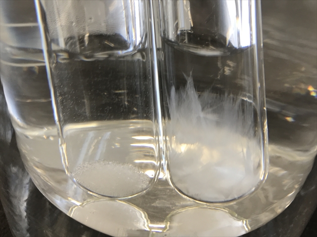 食塩の方は変化がないが、硝酸カリウムの方は針状の結晶が出てくる。