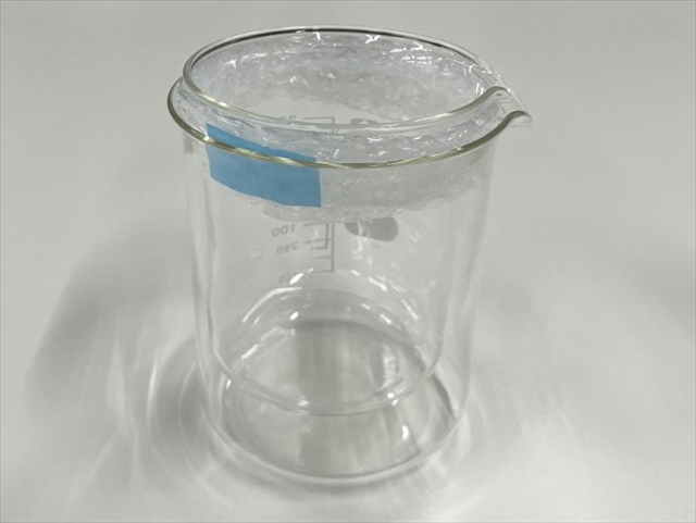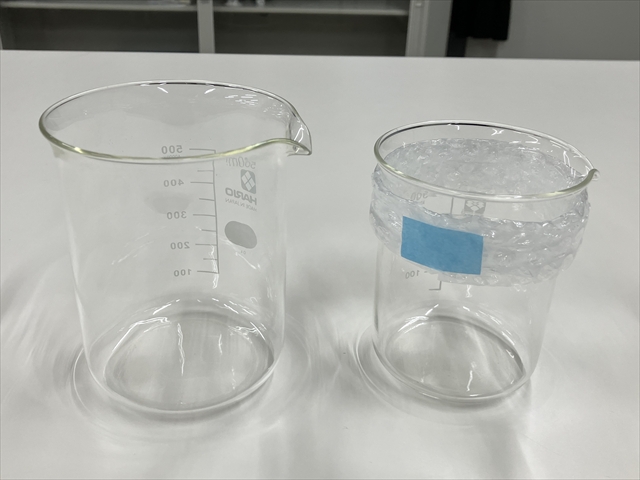 プチプチ(10×27cm)を4つに折って300mLのビーカーに巻き付け、マスキングテープ(またはセロハンテープ)でとめる。そして、500mLのビーカーに押し込むと2重ビーカーができる。二重ビーカーだと氷水を入れてもビーカーがくもりません。プチプチ(10×27cm)は一度作っておけば再利用できます。(ウチダの理科消耗品カタログ「りかもーる」に、二重ビーカーを作るための専用のリング「二重ビーカーキャップ」もあります。1セットが