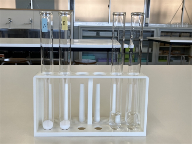 1 A、Bの試験管に、食塩2.2gと硝酸カリウム2.2gをとる。別の試験管2本に、それぞれ水5mLをとる。水はマイクロピペットを使うと簡単に分注できます。