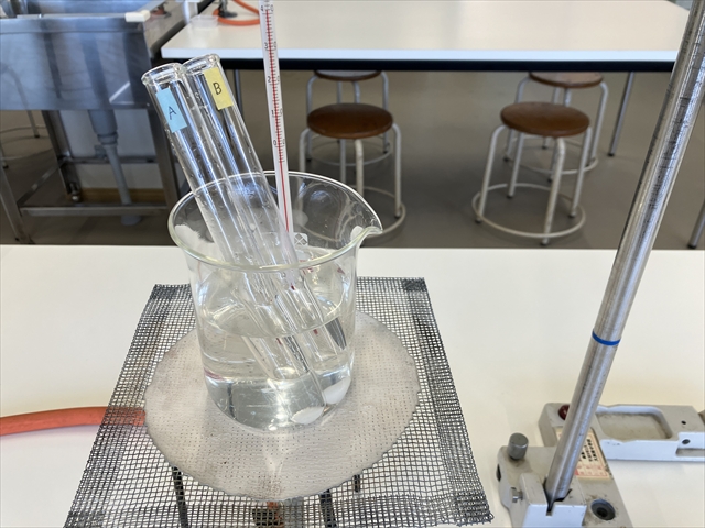 3 300mLビーカーに水を250mL入れ、その中にA、Bの試験管を入れ、ガスバーナーで加熱する。ときどき試験管を取り出して、ふり混ぜる。