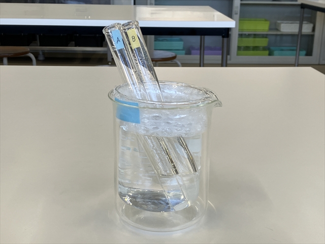 6 A、Bの試験管を、氷水の入った二重ビーカーに入れて冷やす。氷は2、3個でよい。