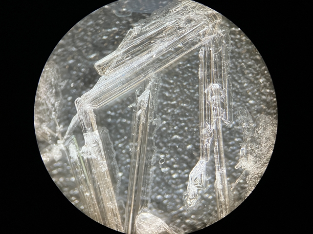 8 A、Bの試験管から、ストロースポイトで、それぞれの水溶液を1滴ずつスライドガラスに取り、乾いてから双眼実体顕微鏡で観察します。(教科書ではガラス棒で1滴取るようになっています。)