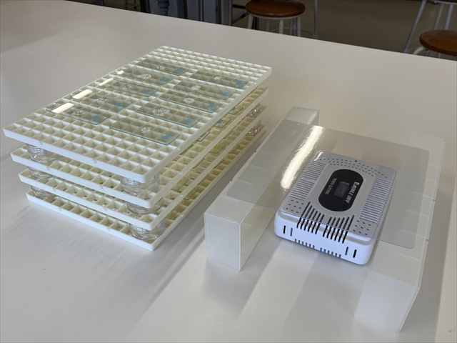 実験のポイントは、①「食塩や硝酸カリウムは5mLの水に2.2gを入れるようにすること」、②水溶液を冷やすときには氷水の入った二重ビーカーを使うこと、③「水を蒸発させて結晶を作るときはモバイルドライボックスを使うこと」の3点です。