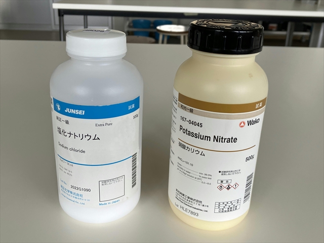 食塩と硝酸カリウに同じ量の水を加え、それぞれを熱したときのとけ方の違いを観察し、その後、冷やして、とけた物質が取り出せるかどうかを調べます。