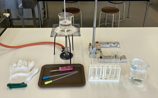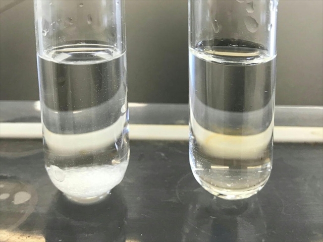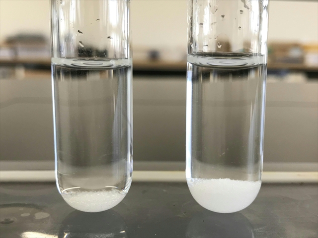 食塩や硝酸カリウムは、教科書では5mLの水に3gずつとかすようになっていますが、冷たい水にとかしたときの溶解度の違いがよく分かるように、5mLの水に2.2gずつとかすようにしています。