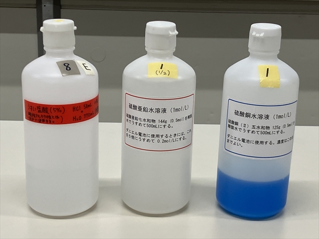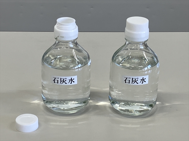 石灰水を入れる容器もいい物がなくて困ります。透明で耐薬品性の高い容器がいいのですが、安価で使い勝手のいい物がなかなかありません。ガラス製の共栓びんは蓋が外れなくなるのでゴム栓にしなくてはなりません。また、注ぐときに垂れにくい容器でなくてはいけません。いろいろ探した結果、私は次の製品を使っています。