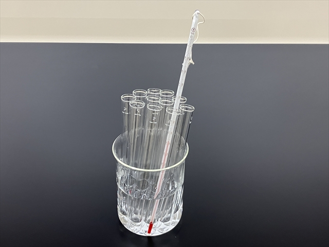 ※ ビーカーから試験管を取り出すと、少しずつ温度が下がっていきます。室温が14.2℃の場合は、1分あたりおよそ1℃ずつ低下します。室温が高いほど温度の下がる割合は小さくなるため、できるだけ室温を高めにしておくとよいと思います。