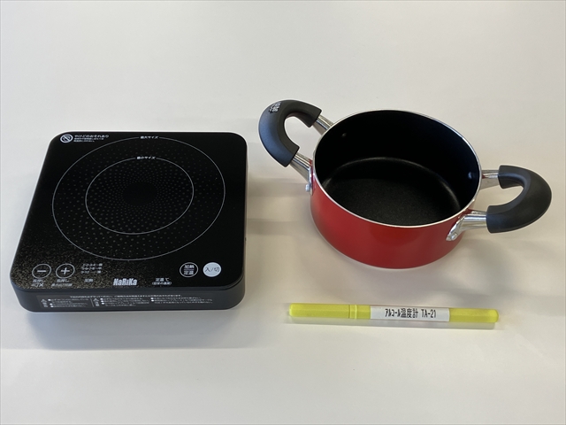 以下の内容は「ドリテック DRETEC 卓上IH調理器 DI-106 BK2」を使った令和元年度の実践です。このコンロは実験用ではなくて、普通の調理用のコンロですが、60℃、80℃、120℃、140℃、160℃、180℃、200℃、220℃の8段階の定温調理ができます。実験では60℃に設定して実験を行いました。
