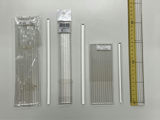 上記のアクリル製マドラーやプラスチック製のマドラーが使用できる。教材カタログにもプラスチック製のかくはん棒が掲載されていますが、長すぎるものは使いづらいので注意が必要である。ガラス棒はビーカーが傷だらけになるので先にゴム管を付ける必要があります。