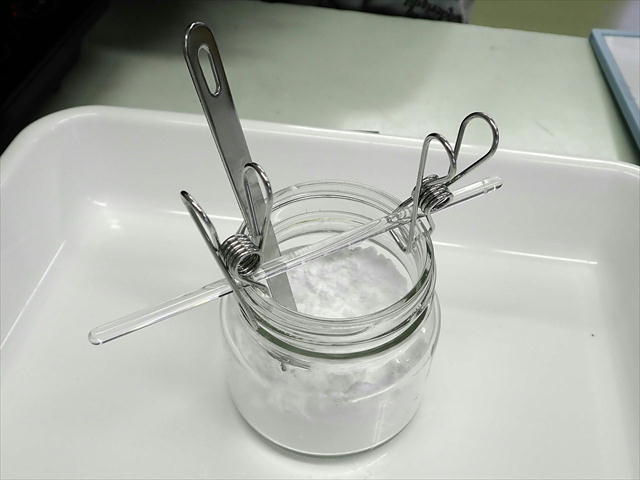 下写真では、100均のステンレス製洗濯ばさみとアクリル製のマドラーで作った「すり切り棒」を取り付けています。アクリル製のマドラーは楽天等で購入できます。アクリル製のマドラーがない場合は、丸箸や割りばし、プラスチック製のマドラーなどでもかまいません。ガラス棒は滑って落ちて割れたりするのでよくありません。次の時間に続けて使用するような時も、ふたをして保管できるので便利です。