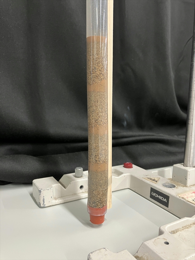 この実験装置のポイントは、透明ホースを使用しているところです。透明ホースにゴム栓を裏返しでさすと、水が漏れません。また、極少量の土砂で実験できますので、実験後の土砂の後片付けも楽にできます。上記の写真の場合、3回土を投入していますが、1回につき15cm^3の土しか使わないので、全体でも土の量は45cm^3しかありません。