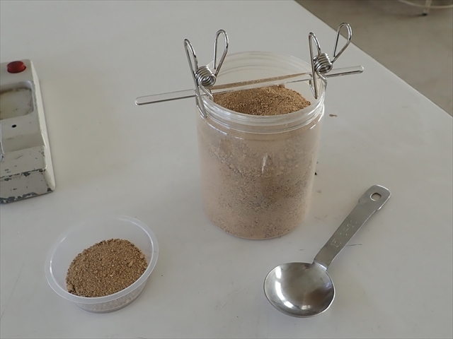 3 2で作った土をプラカップに大さじすり切り一杯(15cc)入れる。土の入った容器に、アクリルマドラーや割り箸をステンレス洗濯ばさみで取り付けてすり切り棒にすると便利。(下写真参照)